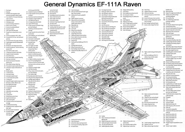 O EF-111A Raven, além de uma carenagem ventral que alojava o sistema AN/ALQ-99E(TJS) com dez módulos de empastelamento, cinco receptores de sinais digitalmente sintonizados e as antenas emissoras de interferências eletrónicas, que ocupavam totalmente o compartimento de armas, dispunha de carenagem proeminente montada na parte superior do estabilizador vertical para acomodar as antenas de receção, para além de uma antena de lâmina de cada lado da fuselagem sob a asa e uma pequena bolha montada no topo de cada raiz de asa com a antena do sistema de alerta de radar AN/ALR-64(V).